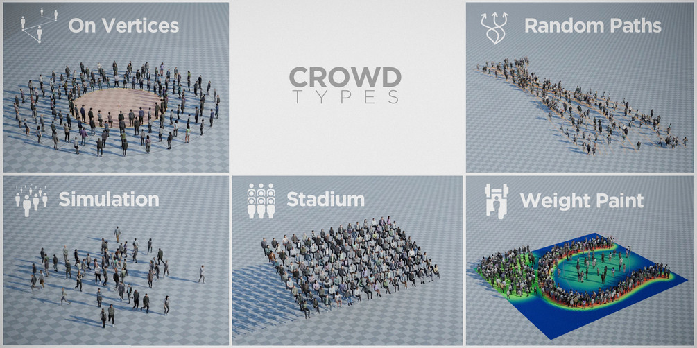 In the standard version this crowd uses particles. With it, you'll get people who walk randomly or follow a specific point. You can also set up what will be the ground and obstacles they can't cross.