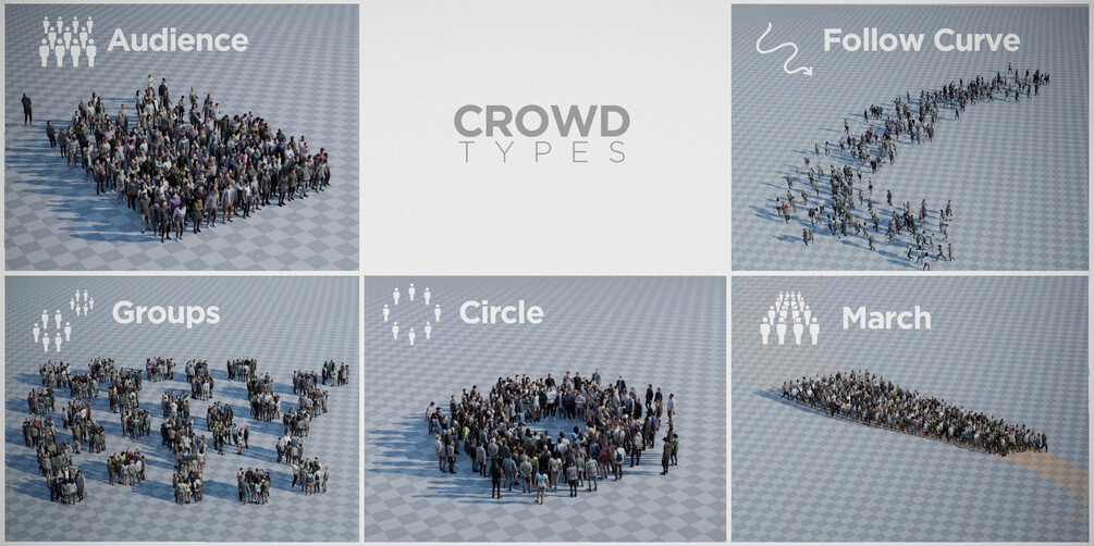 Same as the previous crowd, but in a circle. Decide whether they look towards the center or a specific point, and determine if you want the complete circle or just a section. Also you can choose a ground object for the crowd to adapt to.