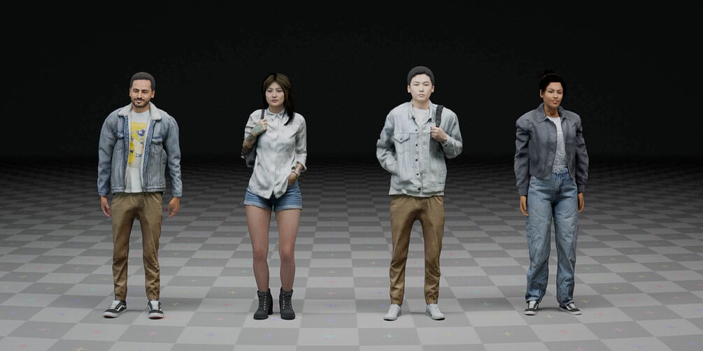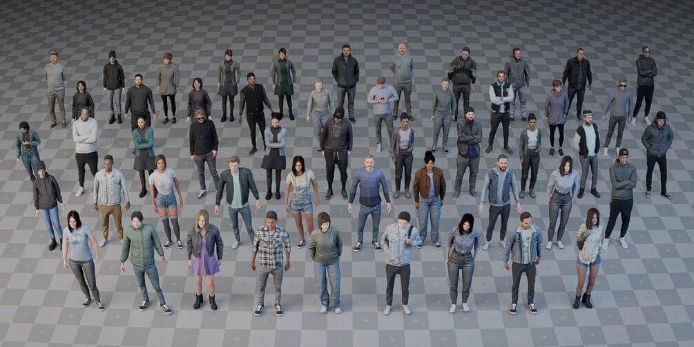 Procedural Crowds Pro gives you more than 50 unique models. Each one features random clothing colors and skin tones to keep things looking diverse and realistic.